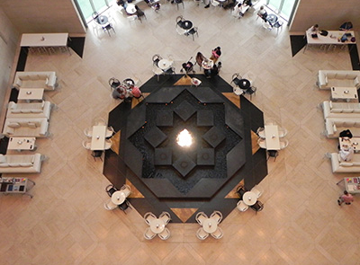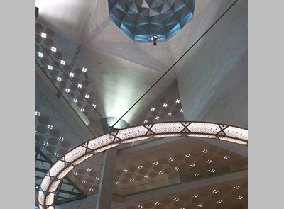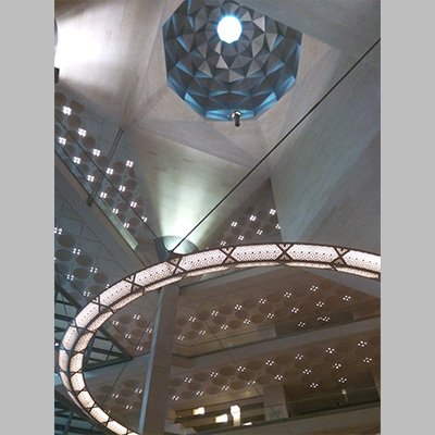 Inside the MIA, the floor, ceiling and walls are decorated with Islamic geometric patterns and… dominating the central hall is an elegant double curved staircase, complemented by a beautiful circular metal chandelier suspended in the middle of the space. This space with the chandelier appear to reinterpret a mosque’s main prayer room.